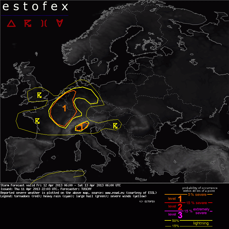 A level 1 was issued for NE France, Benelux and far W-Germany mainly for an isolated large hail and a funnel/tornado event.Valid: Fri 12 Apr 2013 06:00 to Sat 13 Apr 2013 06:00 UTC